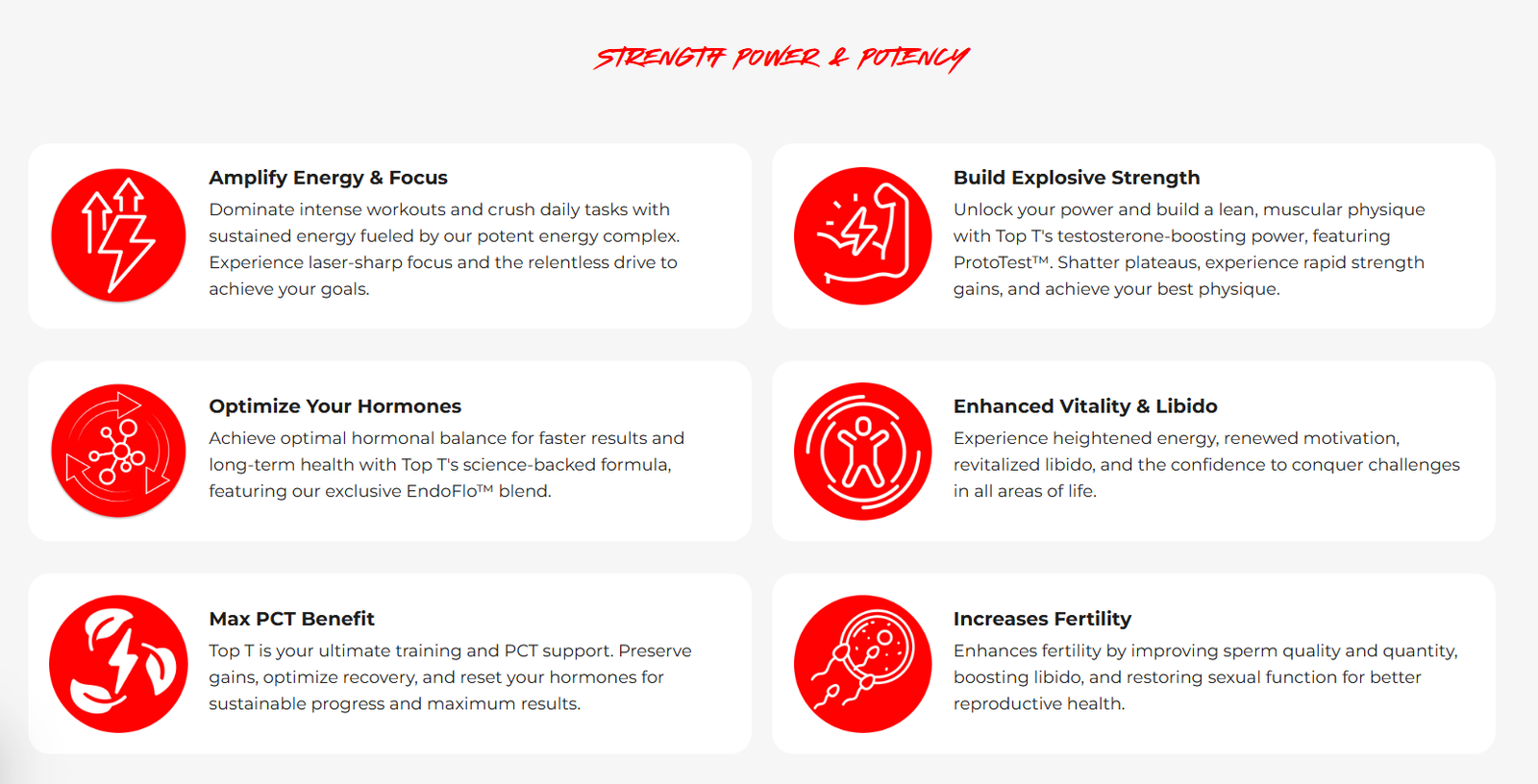 Harness the power of a precision-engineered formula designed to maximize your results. Top T’s meticulously selected ingredients, including performance enhancers, work synergistically to unleash your true potential, delivering unmatched testosterone support, optimized hormonal balance, and accelerated muscle growth.