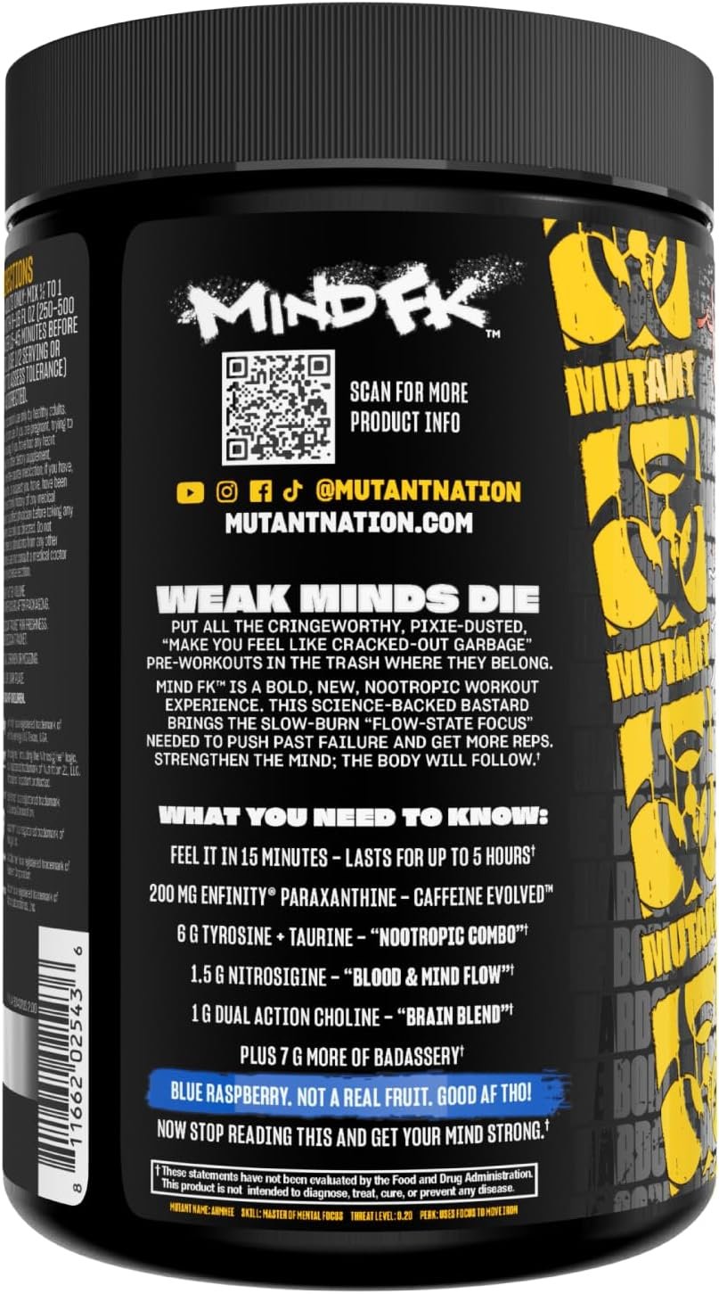 MUTANT® MIND FK™️ is a bold, new, nootropic workout experience. This science-backed bastard brings the slow-burn “flow-state focus” needed to push past failure and get more reps.
