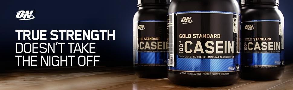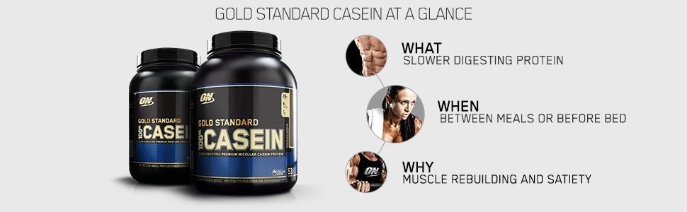 CompareWhile rapidly digesting whey protein is desirable immediately before and after exercise to help support muscle recovery, a slower digesting casein protein is the better choice between meals and especially right before bed when your body can go for hours without nutritional support. Casein proteins thicken in the acidic environment of the stomach and, compared to other proteins, it can take longer for our Gold Standard 100% Casein to be broken down into its amino acid subcomponents. By using only premium micellar casein as a protein source, we’re created a formula that sets the standard for slow digesting protein support.